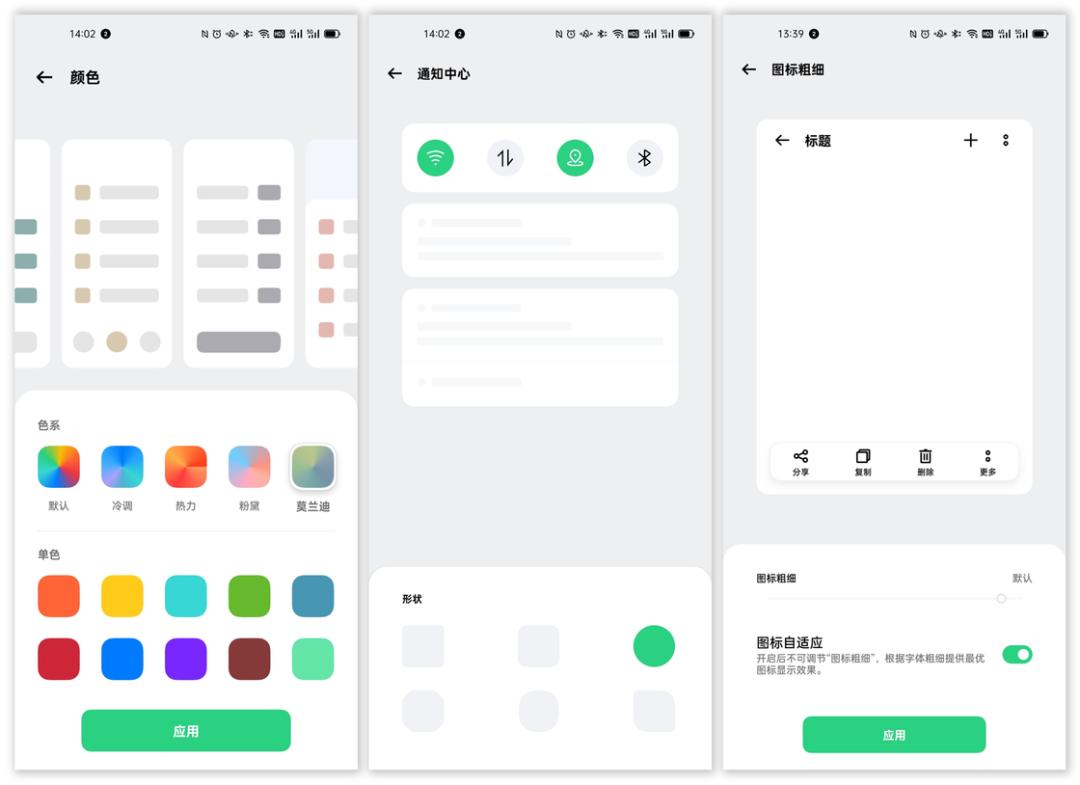 除了上面提到的内容,ColorOS 11 还有不少令人眼前一亮、甚至让老 Android 玩家们看了可能要直呼「内行」的个性化定制选项,比如能够改变全局 UI 配色的系统主题色定制、支持调整通知中心和快速设置面板的开关按钮形状甚至改变内置应用工具栏图标的线条粗细……