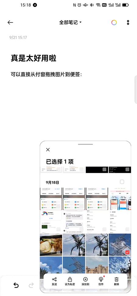 另外,标准尺寸下的浮窗因为可直接交互,所以也具备了一些额外的跨应用协作能力,比如像下面这样直接将图库浮窗中的图片直接拖拽、添加到便签当中,实际使用体验非常顺畅。