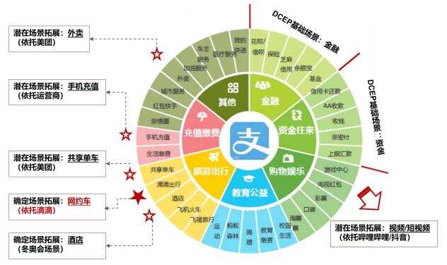 DCEP未来生态拓展图谱:基于支付宝现有支付场景。来源:华西证券研报