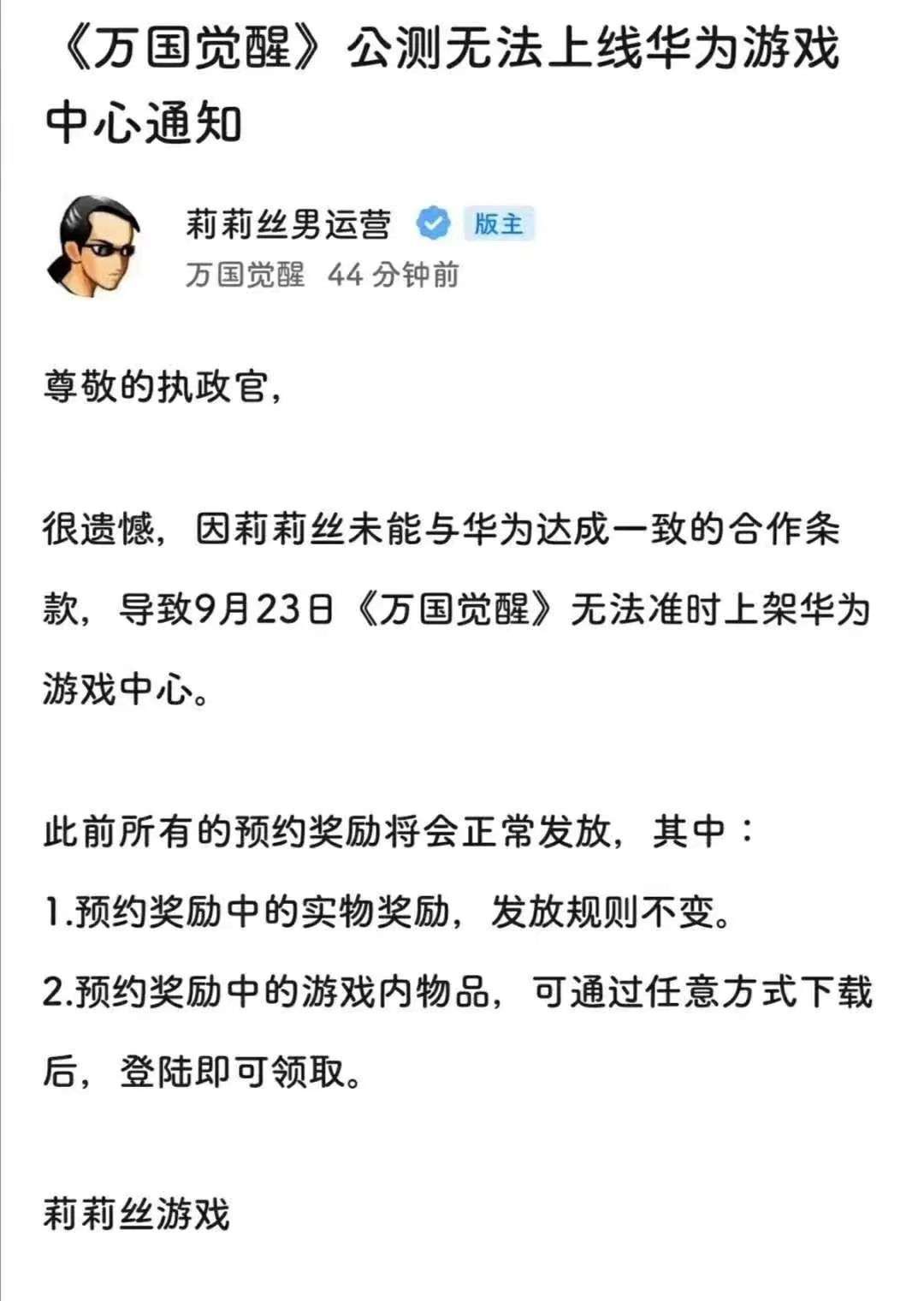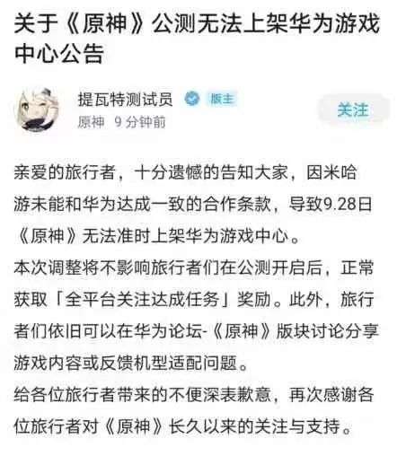 9月23日,米哈游和莉莉丝(很可能是中国最好的两家非上市游戏公司)同时宣布:它们最新的拳头产品——《原神》和《万国觉醒》,不会上架华为游戏应用商店;《原神》还宣布不会上架小米应用商店。