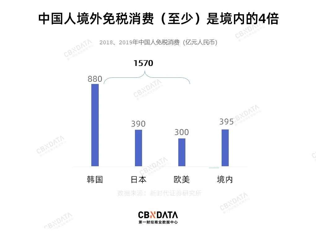 据新时代证券估算,2018年中国居民境外购买免税商品总规模达1800亿元,在韩日和欧美就有1570亿元左右的免税消费。境外免税消费是国内免税市场(395亿)的4.55倍。