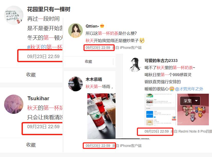 在9月22日之前,“秋天的第一杯奶茶”(或者“XX的第一杯奶茶”)的句式已经存在,并大量运用在营销号话题引导、新媒体运营文案、社区运营话题等许多地方,但其话题的重心是很局限的,即“你要喝哪种奶茶”、“你要不要喝一杯奶茶”。