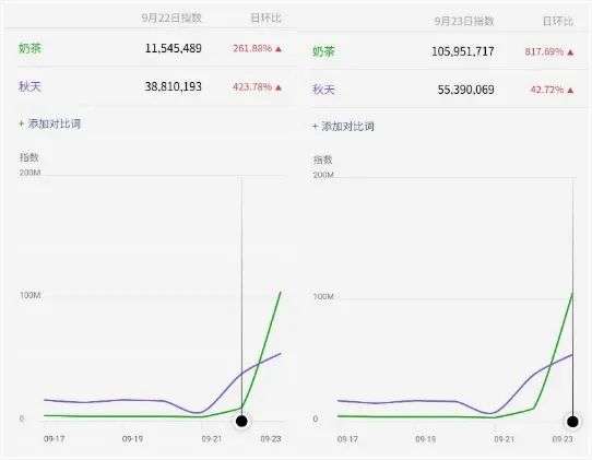 同样,在微信指数上,从9月22日起,关键词“奶茶”迅速发酵,当天的增长日环比高达260%,并在23号高歌猛进,热度达到前一天的8倍。