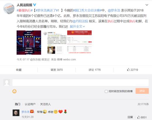 同时,在相关信息公开网上,已经查询不到罗永浩被列为“老赖”的相关信息。距离他一年内还清剩余债务的目标已经不远。