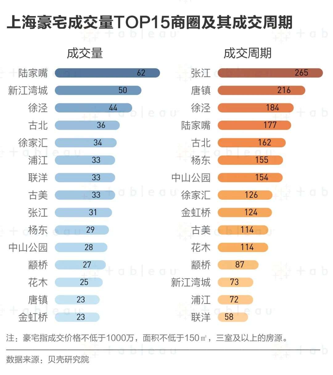 当然,这和嘉定区汽车行业大佬集中,但区域内豪宅产品较少或许也有一定的关系。于是,我们继续挖掘,细化到商圈,找到了豪宅成交量最大的15个商圈以及每个商圈的豪宅成交周期中位数。
