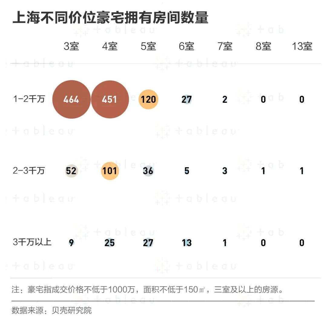 依旧按照价格划分,DT君用 Tableau 作出气泡图后发现,无论是1-2千万,还是2-3千万,豪宅的户型都集中在3室或4室。只有价格达到了3千万以上,5室及以上的占比才多了起来。