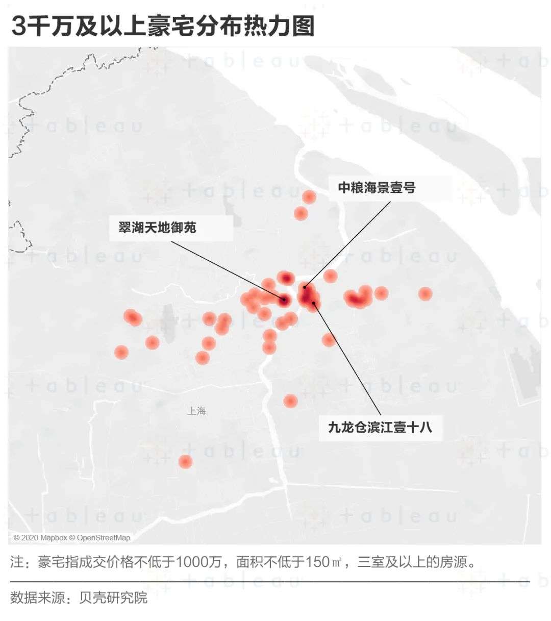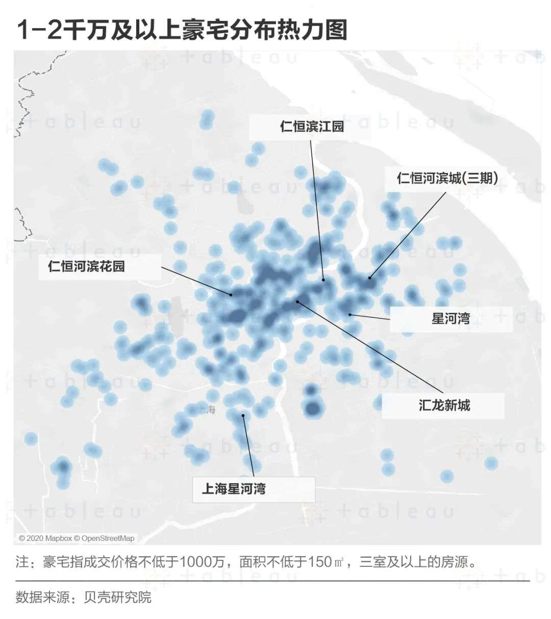 上海寸土寸金,总体房价实在过于感人,若是光看价格似乎遍地都是豪宅。为了排除掉价格不菲的老破小,我们将“豪宅”的标准定义为:“总价1000万及以上”+“总面积150㎡及以上”+“三居室及以上”。