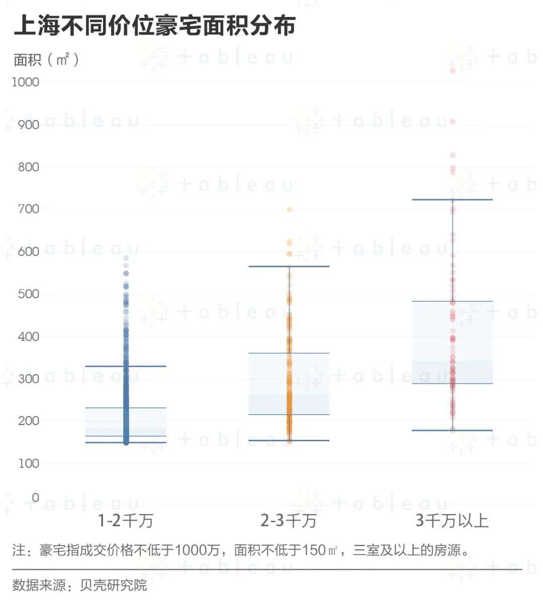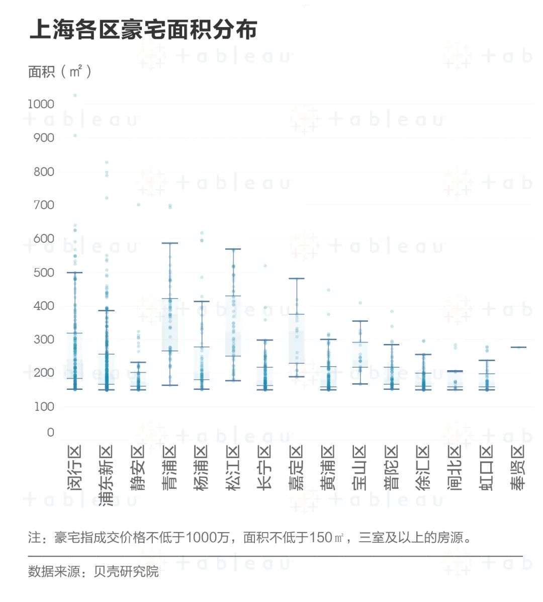 同样,再根据地区进行划分,我们在 Tableau 上分析后发现:如果想用同样的价格买到更大的豪宅,还是得往市区外走走。如松江、青浦和嘉定的豪宅,房屋整体面积都要胜市区同类型产品一筹。尤其是青浦区的豪宅,它们的面积中位数将近400平。
