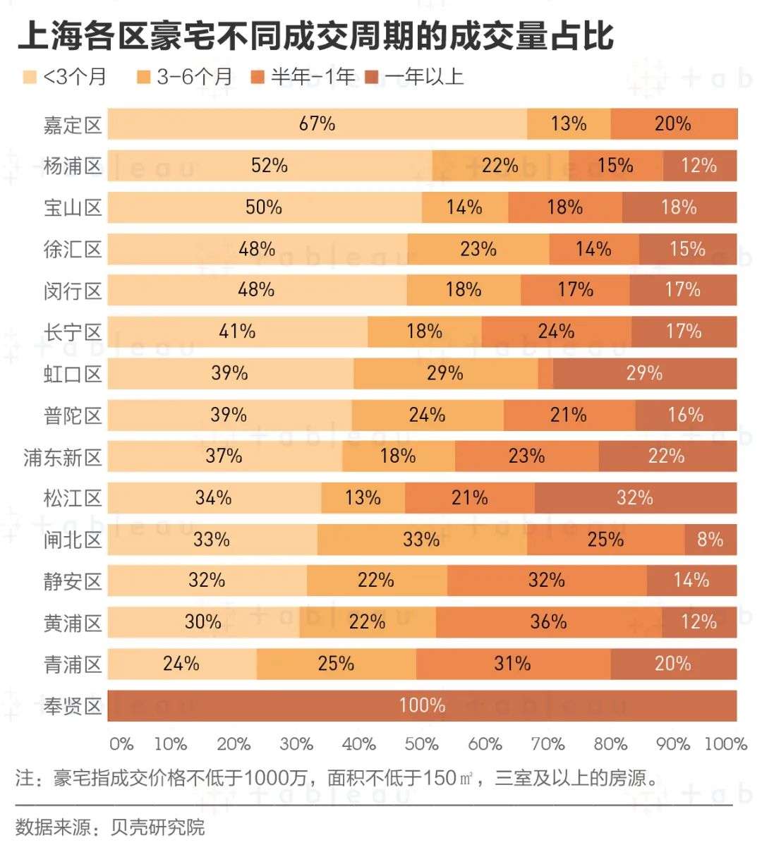 根据数据,我们用 Tableau 绘制出了各个行政区下豪宅的成交周期分布占比。豪宅最好卖的地区并非我们之前提到的浦东、闵行等热门大区,也不是我们想象中富人聚集的青浦、徐汇等区,而是上海西北角的嘉定区。