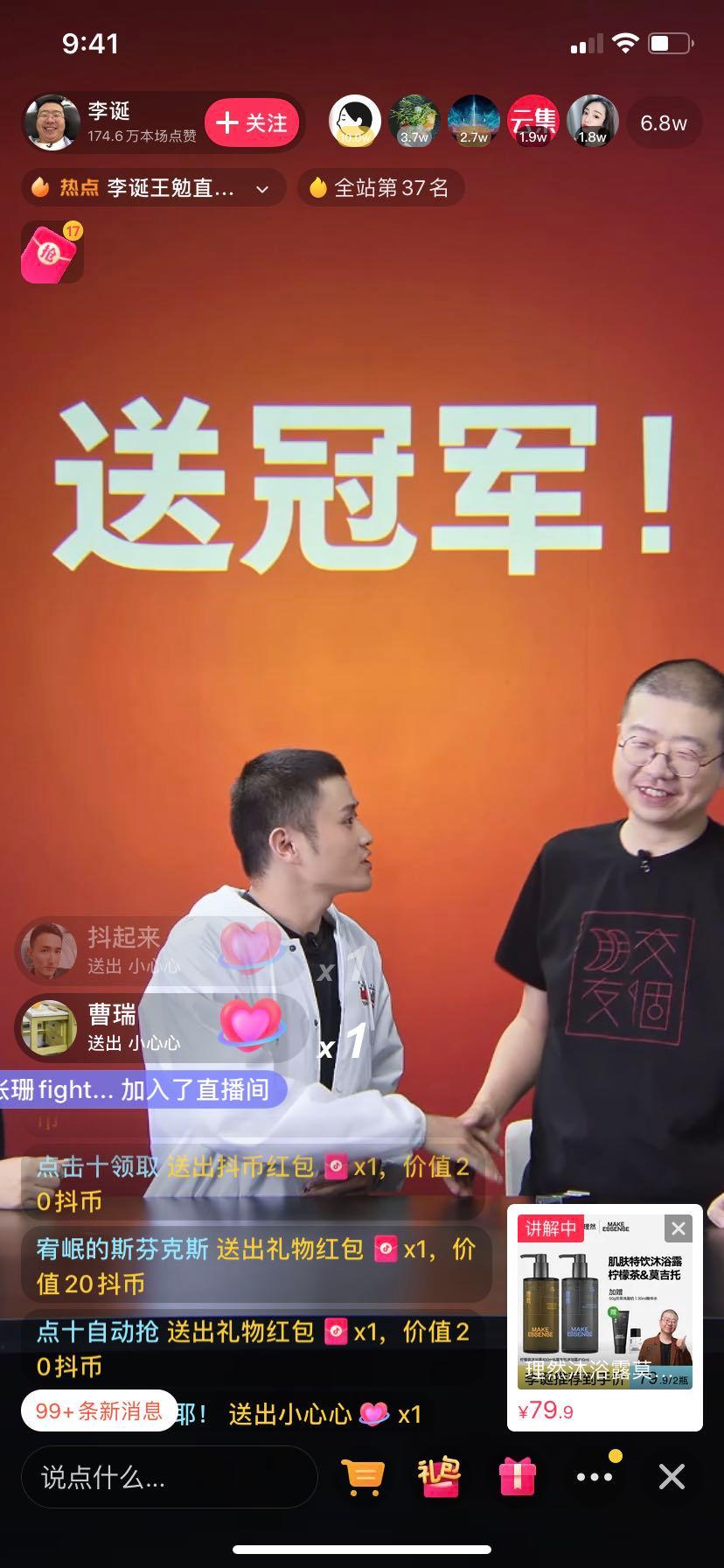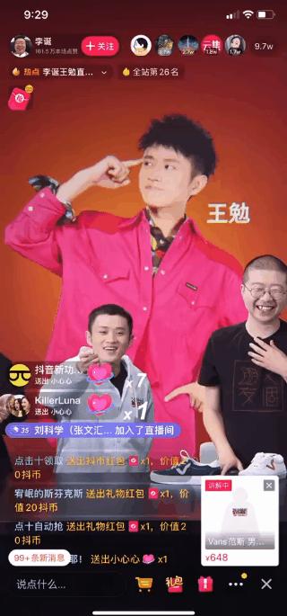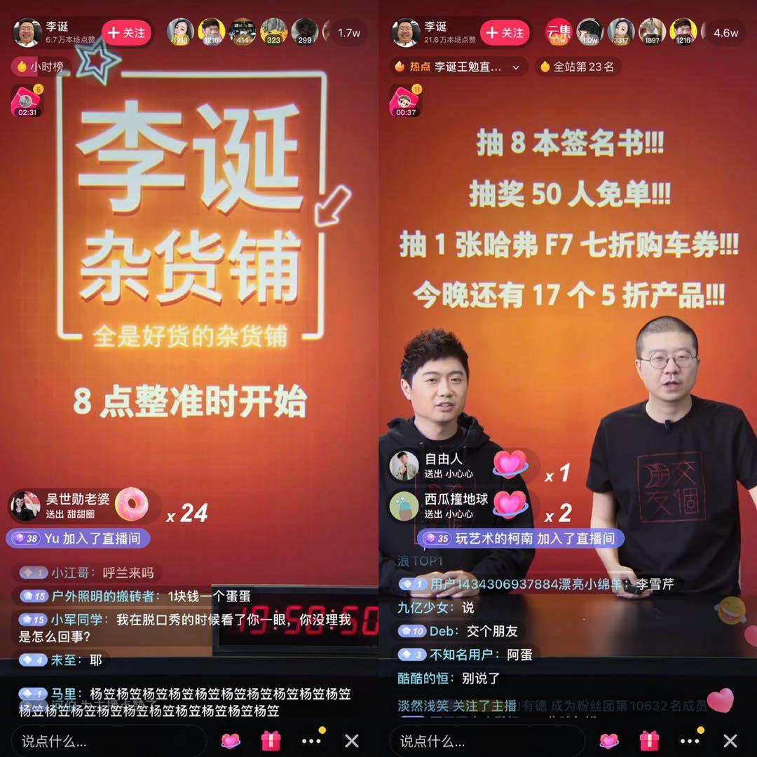 2. 为了让直播准时开始,李诞在后台踩着秒喊“有了吗?可以了吗?听到了吗?五四三二一!”随后从右侧先露出了颗头,继而和助播(罗永浩团队的黄贺)一同登场,并呼吁:“动动大家发财的小手,点点小红心。”