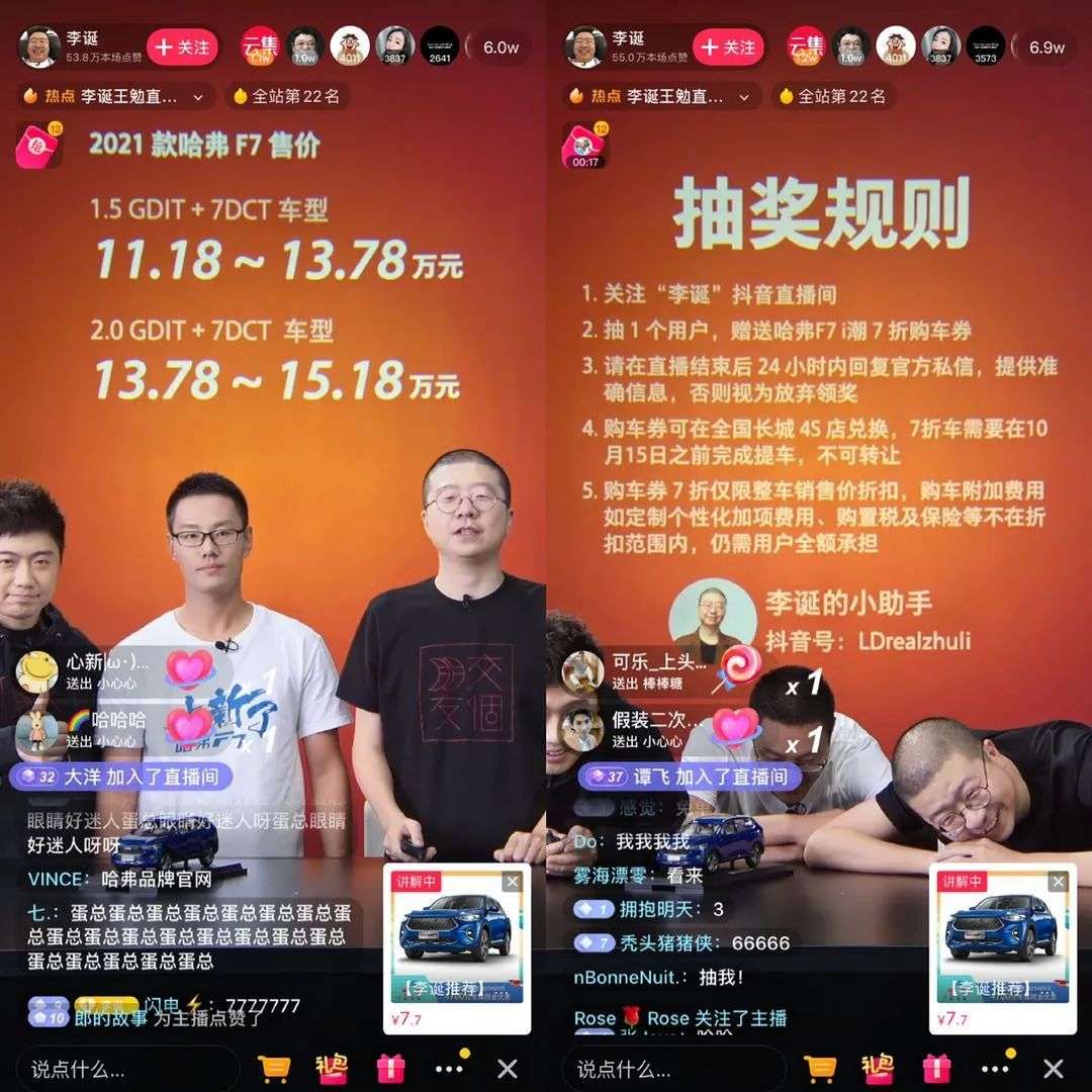 7. 第一个产品居然是一款车的优惠券,非常不走寻常路。直播间请了品牌商营销总监“王总”。为了让观众截屏抽奖规则,3个人一起被按趴下。