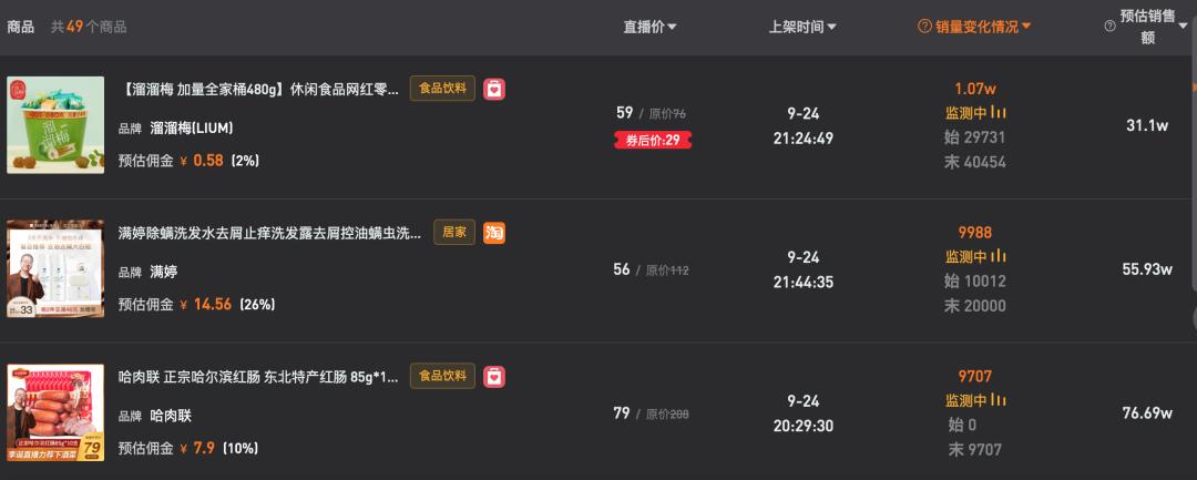 整场销量最高的是溜溜梅(1.07万件)、满婷洗发水(9988件)和哈尔滨红肠(9707件)。