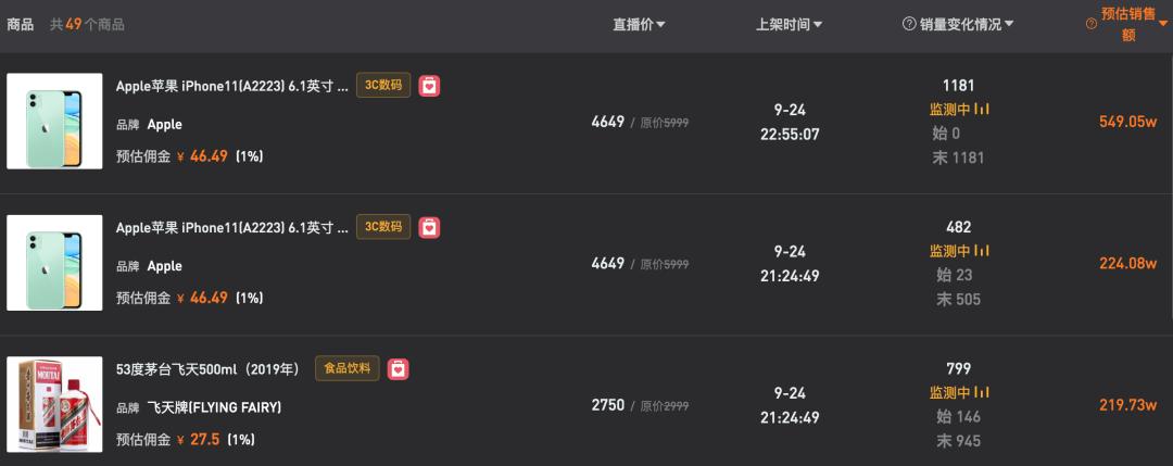 商品销售额上,苹果手机(540.05万、224.08万)和茅台酒(219.73万)名列前茅。