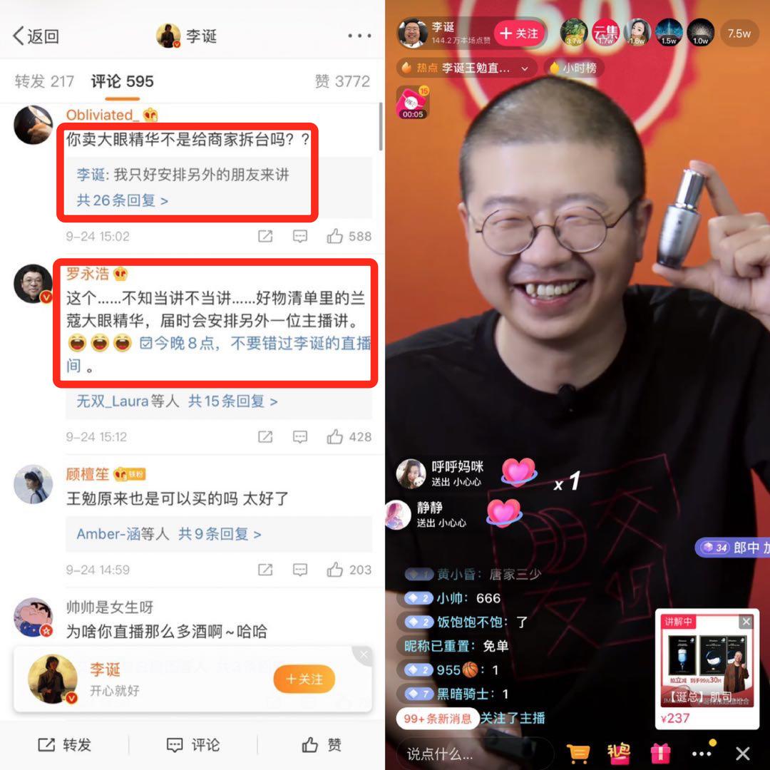 12. 到某品牌的大眼精华时,直播间给了李诞的小眼睛一个超大的特写。此前,针对该产品,李诞和罗永浩曾在微博上表示“届时会安排另外一位主播讲”,但实际直播中,主播没有发生更换。