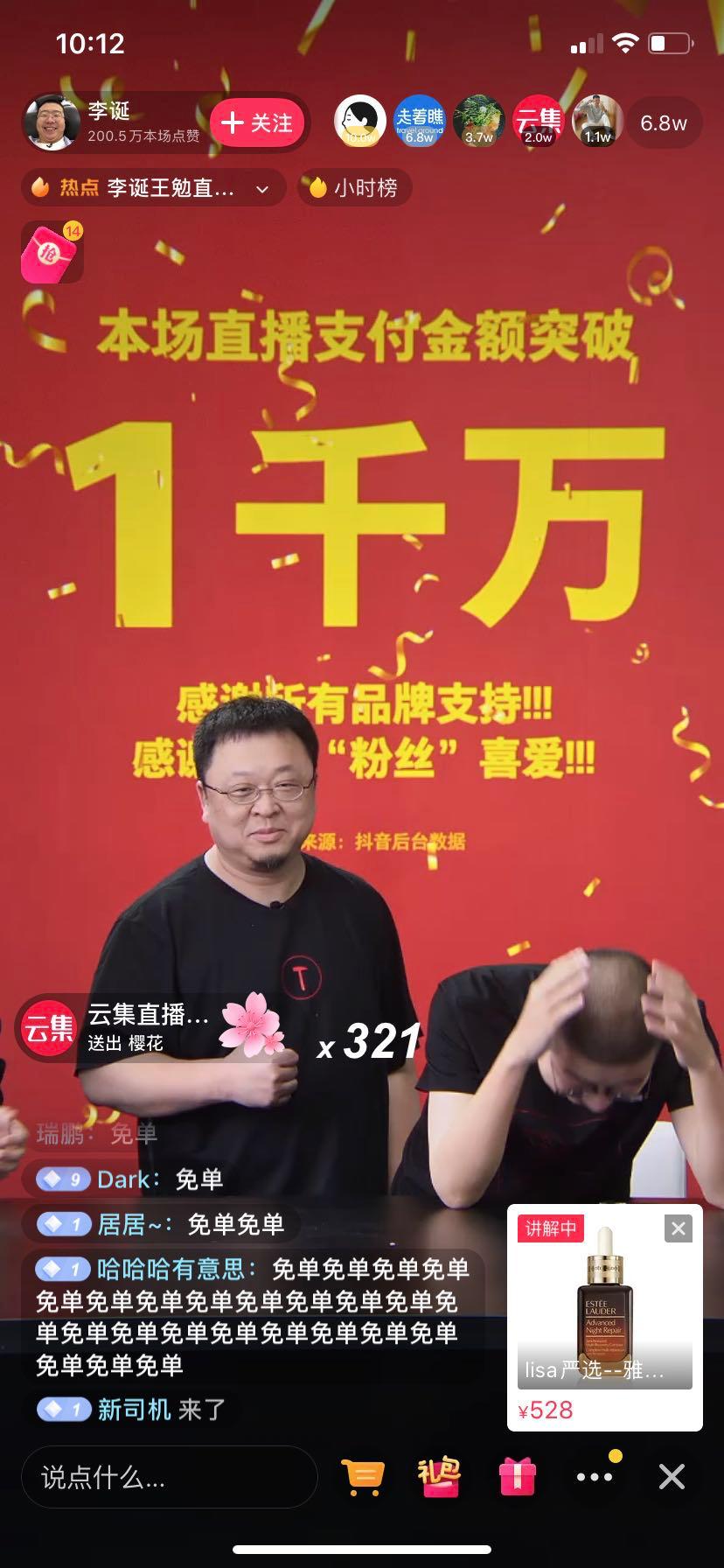 15. 直播开始后2小时12分,直播间显示销售额破一千万,伴随着联欢晚会喜庆BGM,罗永浩登场庆贺。