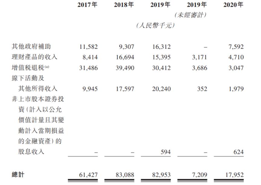 2017-2019年以及2020年一季度,公司其他收入共计6142.7万元、8308.8万元、8295.3万元、1795.2万元,占当期净利润的比例为84.38%、50.96%、35.81%、121.77%,一季度的其他收入已超过了净利润。