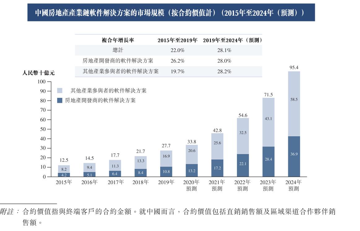 明源云招股书提到,房地产SaaS解决方案市场从2015年的125亿元增至2019年的277亿元,预期2024年达到954亿元,逼近千亿发展规模,预计2019年至2024年的复合年增长率为28.1%;即便是按照28.1%的年复合增长率来计算,2024年软件解决方案的渗透率也只有0.3%,远低于美国2019年的1.55%。
