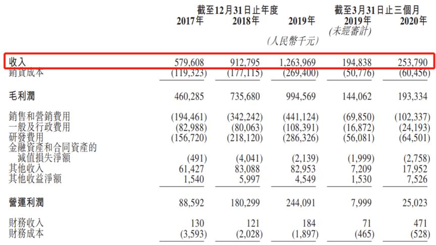 2017至2019财年,明源云营业收入分别为人民币5.8亿元、9.1亿元、12.6亿元,年复合增长率为47.7%,对应的净利润为0.73亿元、1.63亿元、2.32亿元,年复合增长率高达78.4%。毛利润由2017年的人民币4.6亿元增至2019年的人民币9.95亿元,复合年增长率为47.0%,毛利率分别为79.4%、80.6%、78.7%;净利率分别为12.6%、17.9%、18.3%。2020年一季度实现营收2.54亿元,同比增长30.3%;净利润0.147亿元,同比增长112.03%,净利率5.8%。