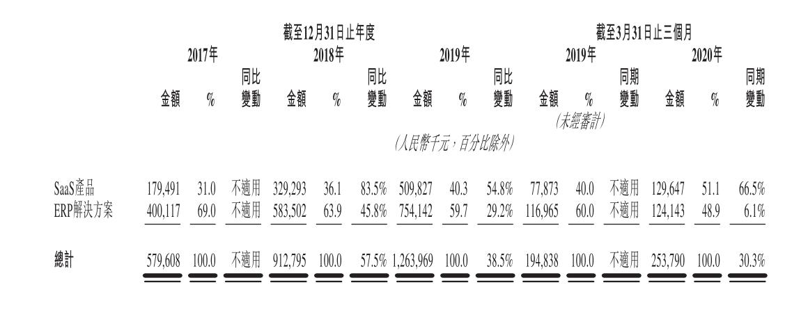 明源云在2017年、2018年及2019年以及2020年Q1,其SaaS产品的付费客户数量分别为1600、2500、3600及3100,销售收入分别为1.795亿元、3.29亿元、5.098亿元及1.296亿元,占总收入的31%、36.1%、40.3%、51.1%,增速分别为为83.5%、54.8%、2019年未统计、66.5%。