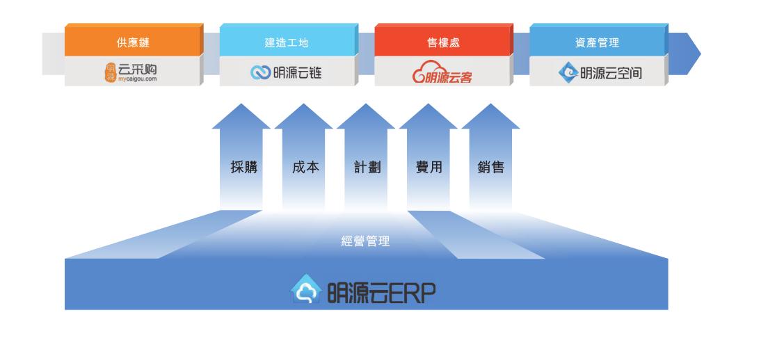 通过云技术,明源的SaaS产品与原本的采购、成本、计划、费用、销售等ERP产品进行了整合,形成了明源目前的产品架构。