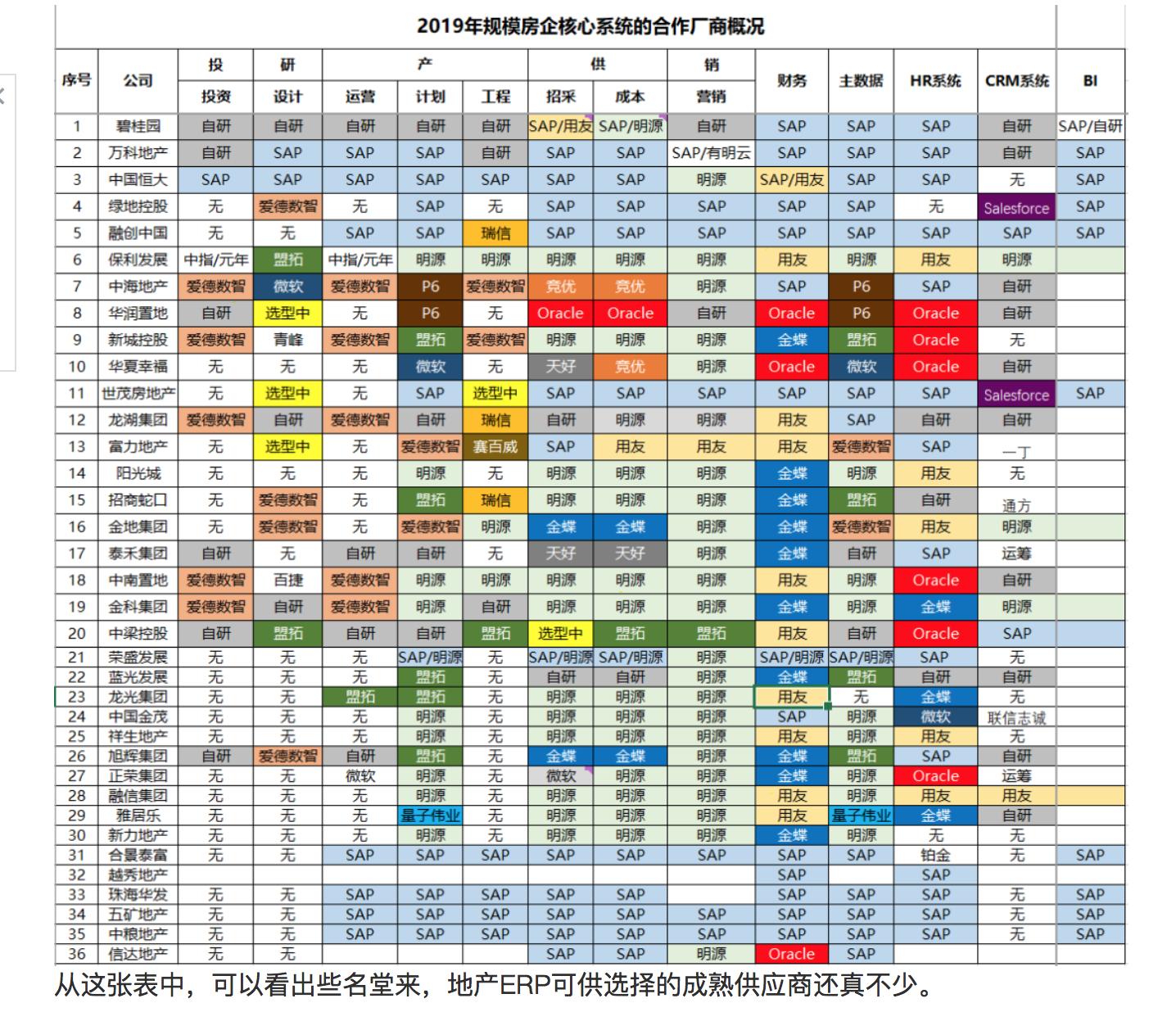 听起来是可怕的市占比,但根据下图,百强客户的大部分也只是采购了明源ERP的某个小环节,甚至万科、绿地、融创完全没有使用明源的产品;某地产龙头企业的信息化负责人曾向36氪作者表示:“明源能给到的东西,我们都已经做出来了。”