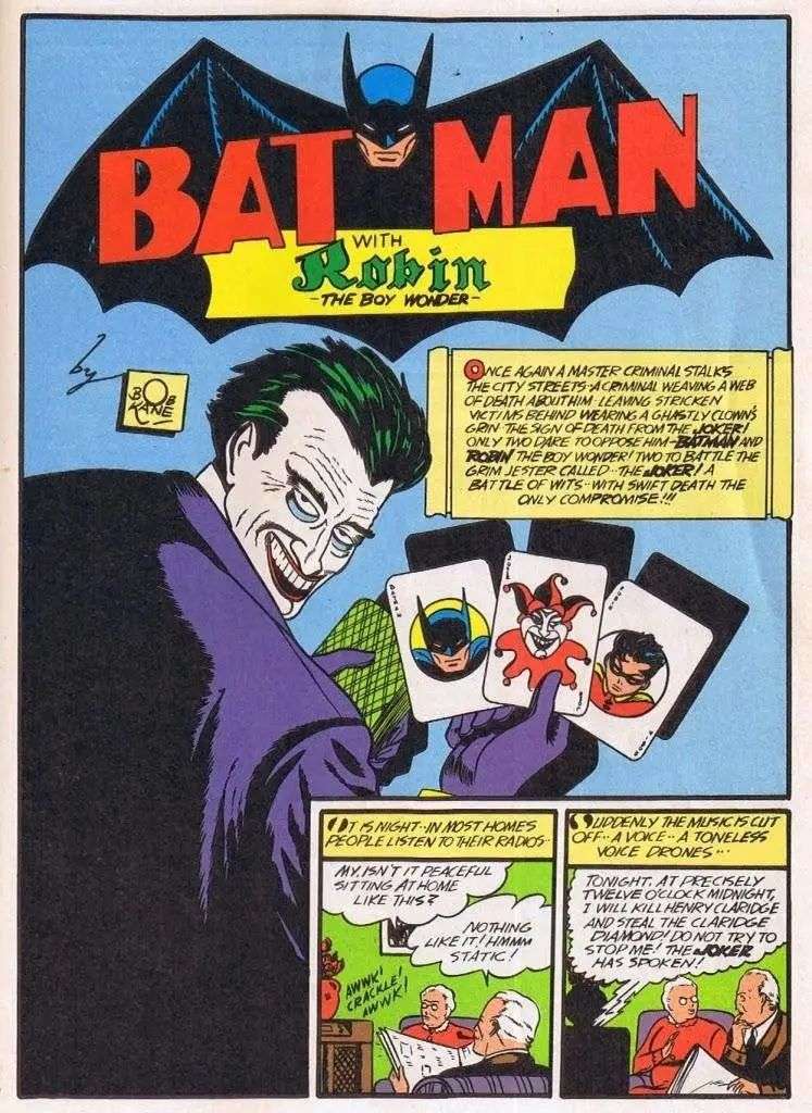 1940年4月25日的《蝙蝠侠》第1期,由比尔·芬格、鲍勃·凯恩和杰瑞·罗宾逊(Jerry Robinson)共同创作