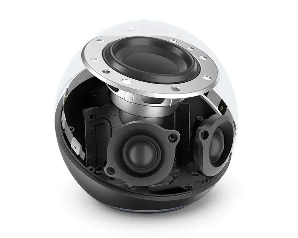 球体音箱大面积覆盖了布料材质,其外观与谷歌在2012年发布的球形流媒体播放器Nexus Q十分相似。