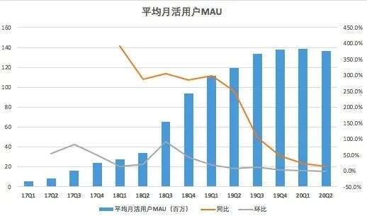 从过往趣头条披露的财报数据可以看出,趣头条用户高速增长的神话已破灭。财报显示,2020年二季度趣头条的平均月活跃用户(MAU)为1.365亿,较去年同期为1.193亿,增长14.4%,低于一季度24.1%的同比增速。