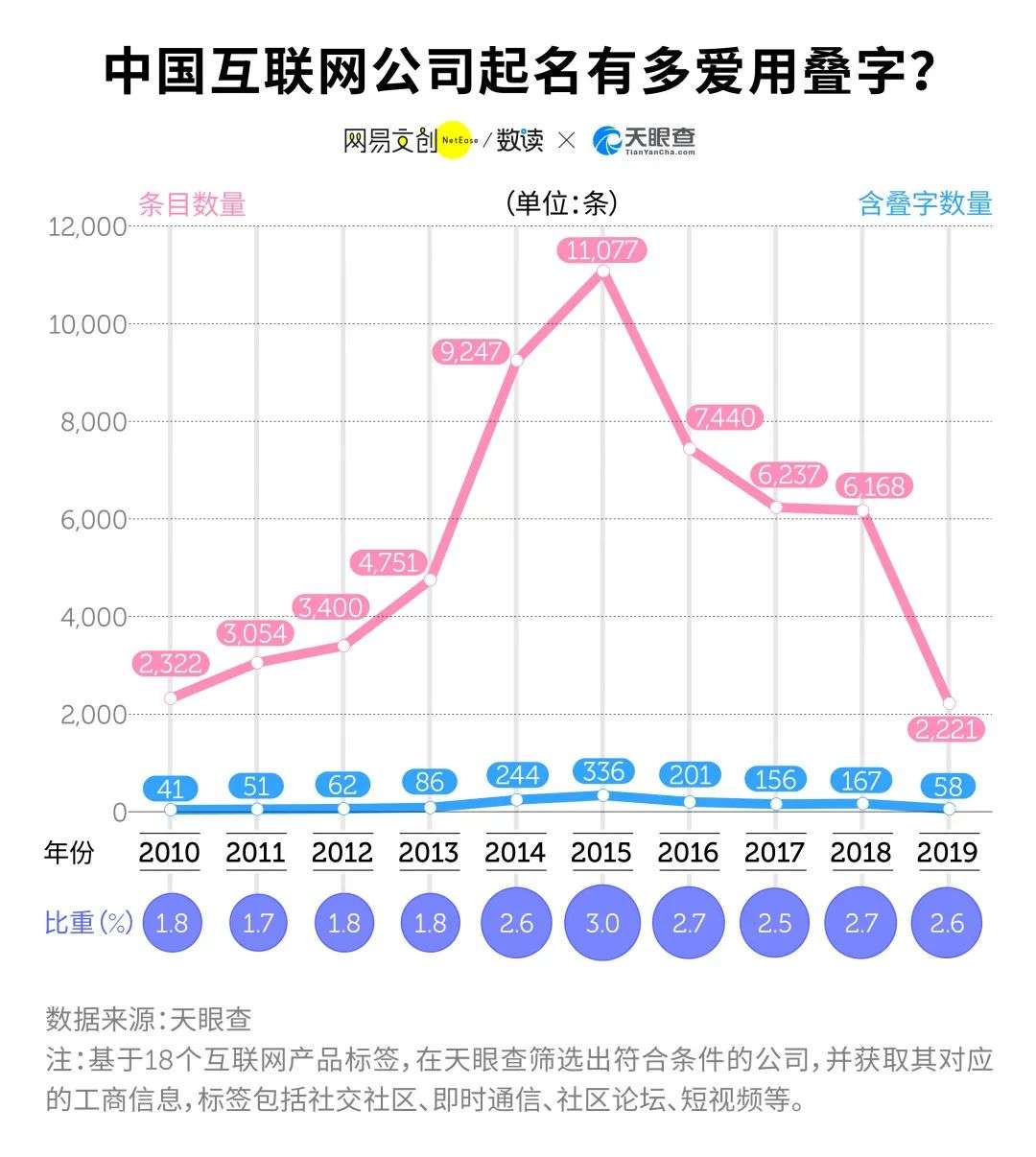 在天眼查的 7 万条数据里,叠字高峰出现在 2015 年。“全民创业”的这一年,约有 3% 的互联网公司选择在名字里带个叠字;此后,带叠字的公司比例稳定在 2.5-2.7%。