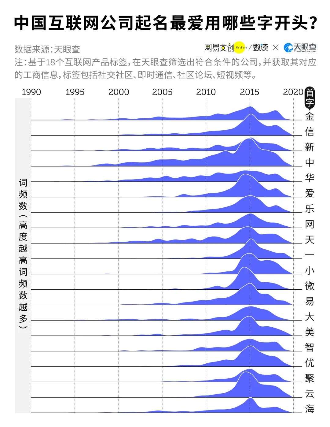除了公司的名字,我们还通过天眼查获取了这 7 万家公司的工商信息。尽管时代变迁,技术升级,但我们惊讶地发现,互联网公司起名最爱用的第一个字,竟怎么也绕不开: