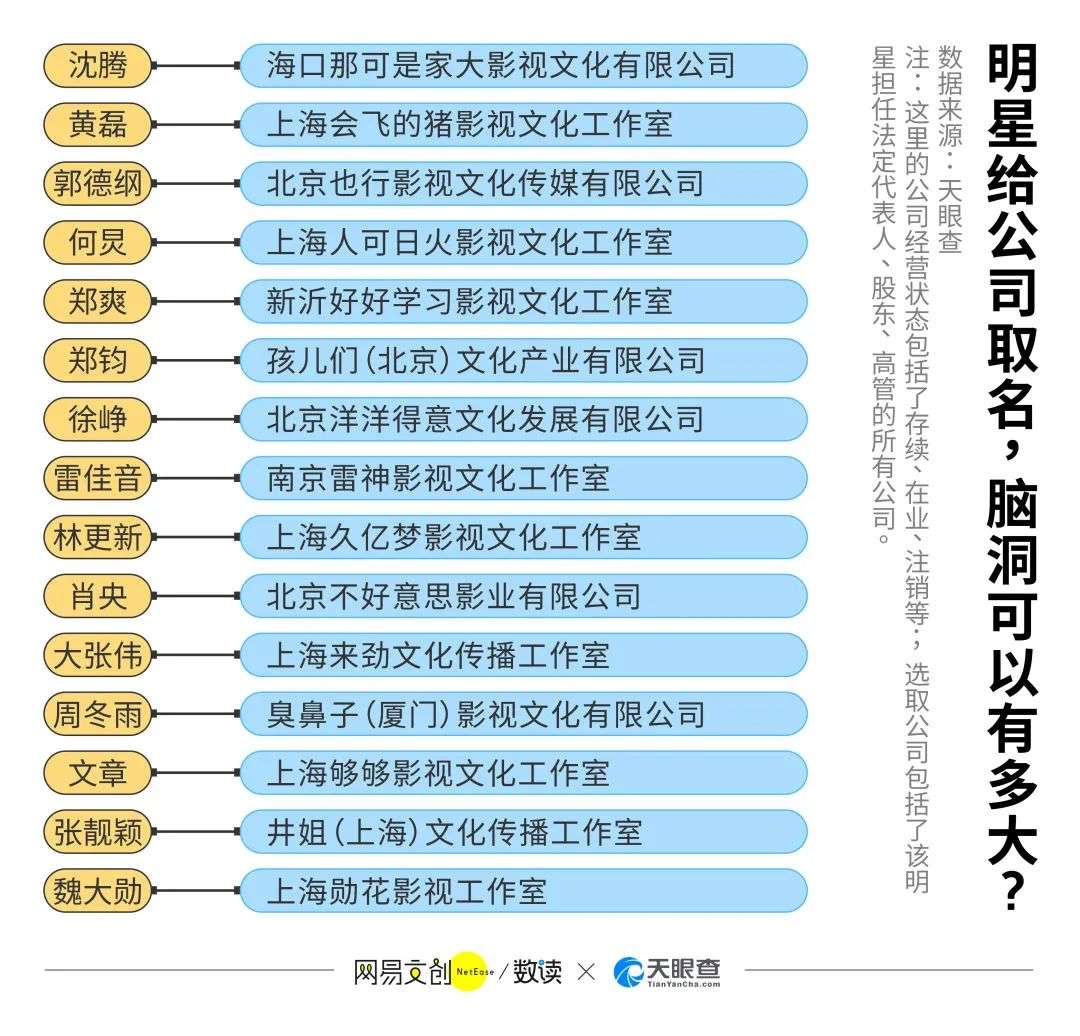 当然,也有大佬们肆意放飞自我。例如,黄磊老师的工作室叫“会飞的猪“;张靓颖的公司叫“井姐”;周冬雨开了“臭鼻子(厦门)影视文化有限公司”;郭德纲老师的公司是“北京也行影视文化传媒”;郑钧老师的叫“孩儿们(北京)文化产业有限公司”。