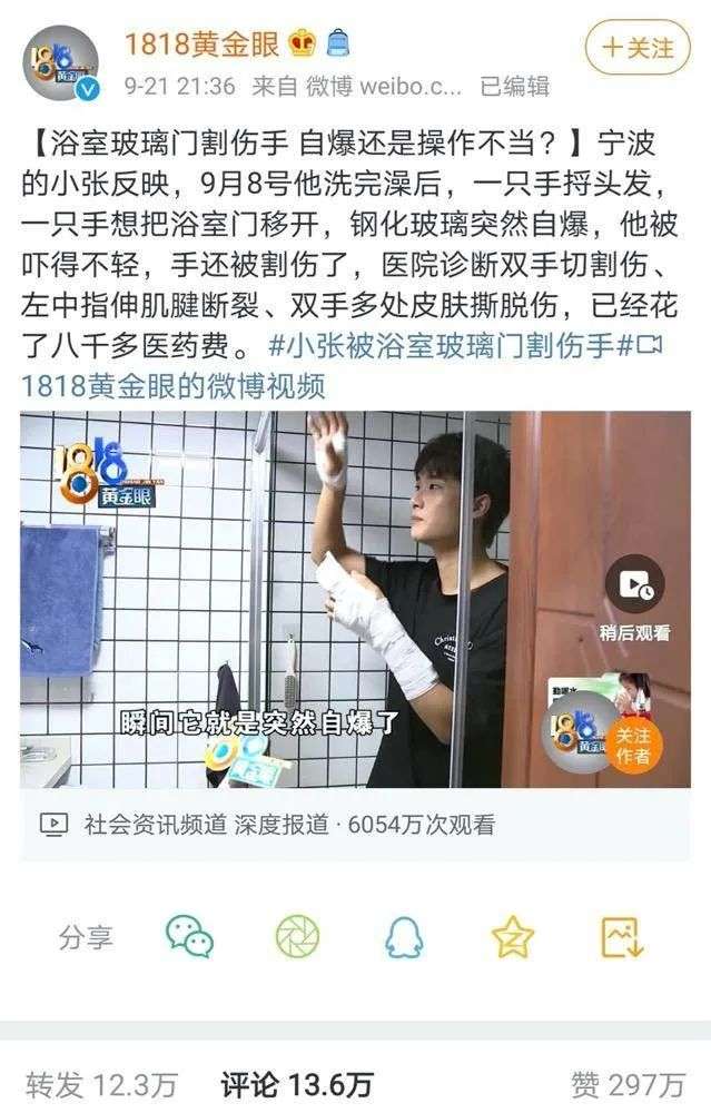 据《1818》的视频报道,小张是宁波“富宁·寓”的一位租户,在9月8日洗完澡后,还未接触门把手推开浴室门,淋浴间的钢化玻璃就突然自爆,将他的双手割伤。医院诊断为双手切割伤,左中指伸肌腱断裂、双手多处皮肤撕脱伤,医治费用已超过八千元。