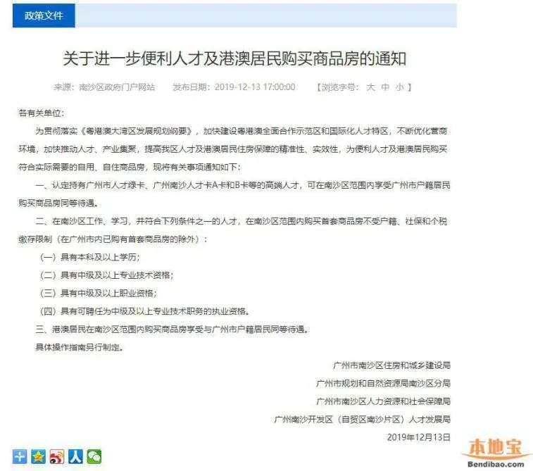 去年12月13日,广州市南沙区人民政府发布《关于进一步便利人才及港澳居民购买商品房的通知》,本科及以上人才在南沙区范围内购买首套商品房不受户籍、社保和个税缴存限制(在广州市内已购有首套商品房的除外)。