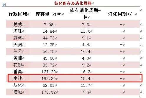 据克而瑞数据,在去化方面,目前整个南沙的库存量位居广州首位,达192.3万平,去化周期在广州各区中位居第四,去化周期高达15.4个月。