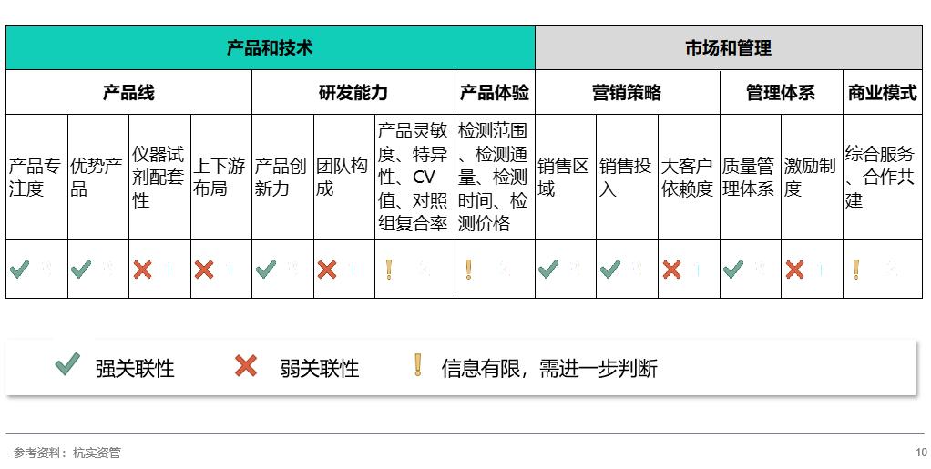 由于信息有限,其他指标的关联性需要进一步判断。如体现产品质量的产品灵敏度、特异性、CV值、对照组复合率,体现产品体验的检测范围、检测通量、检测时间、检测价格。商业模式方面,例如是否提供综合服务和采取合作共建。