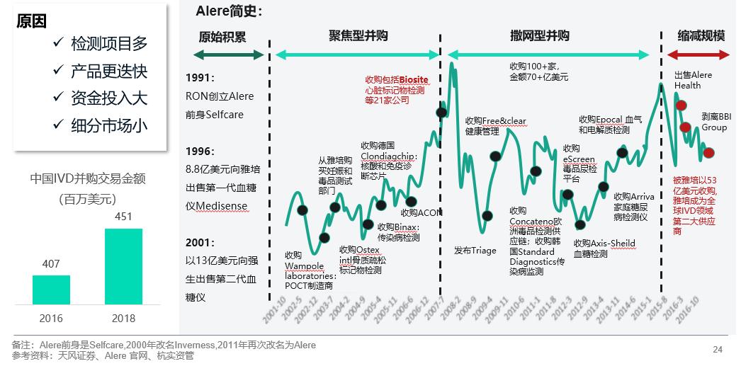 IVD行业的特点决定了收并购会成为常态。主要因为检测项目多、产品更迭快、资金投入大、细分市场小。体外诊断在西方国家是成熟产业,如果参看POCT巨头Alere,它的成长就是一部收购和被收购史。在Alere 原始积累阶段,创始人将主要技术产品血糖仪分别出售给雅培和强生;2001到2015年Alere在免疫、分子、POCT等各个领域疯狂收购,光是2007年就收购了21家公司。2016年,公司开始缩减规模,最后被雅培收购。