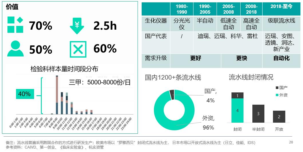 从流水线自身的发展来看,90年代开始就有国产化布局,但多以和外资合作、代工的形式生产。迪瑞、迈瑞、科华、雷杜是早期厂家代表——经历了从半自动、低速全自动、高速全自动、到级联流水线。目前国内流水线基本被外资垄断,外资品牌的封闭设计,进一步挤压中小厂家空间。国内现存1200条流水线中,罗氏、西门子、贝克曼、雅培、日立占据了96%。