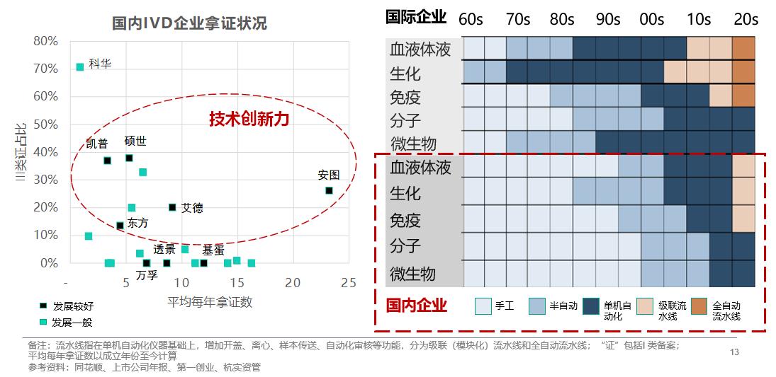 体外诊断行业发展迅速,要求企业具备更高的技术创新力。工艺上,经历了手工、半自动、单机自动——当前国内导入的是级联流水线和全自动流水线。检测方法上,精度要求越来越高,检测标志物的浓度不断提升,经历了从生化、免疫到分子诊断。