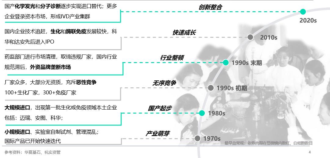 第一阶段是70年代产业萌芽——国内小规模进口,实验室自制试剂,管理混乱;
