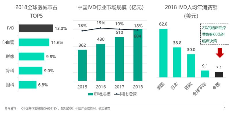 IVD行业市场大、发展快、有成长潜力。它是全球医疗器械最大的细分市场。2018年以13%的市占率排名第一,高于心血管(11.6%)、影像(9.8%)和骨科(9%)。 2018年中国IVD行业的市场规模达到604亿元,并且每年以18%-19%的速度稳步快速增长。