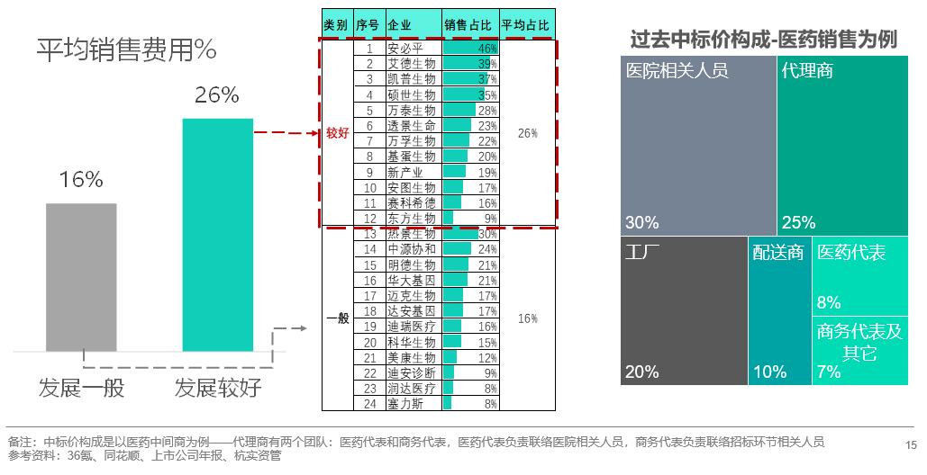 研究发现,发展较好的企业重视渠道建设——平均销售费用占比达26%,而发展一般的企业只有16%。较好的企业中,安必平销售占比最高,达46%。艾德、凯普、硕世的销售占比也分别高达39%、37%、35%。
