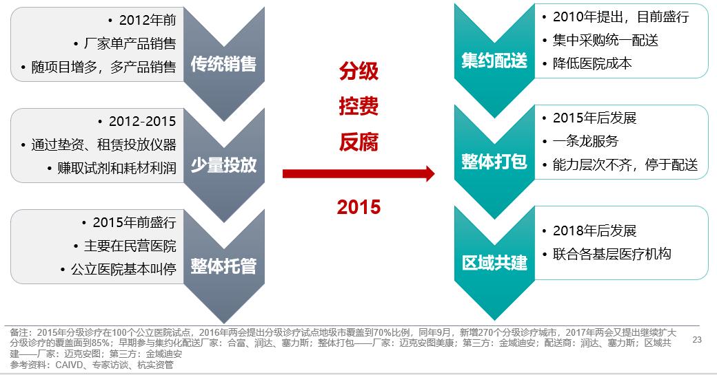 主要分为两个阶段,2015年前和2015年后。2015年前,最早以传统销售为主。2012年后出现小规模投放,即厂家通过垫资和租赁向医院投放仪器,赚取试剂和耗材的利润。检验科整体托管曾经盛行,目前主要存在于民营医院。
