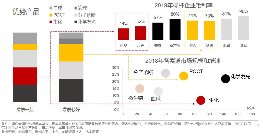 “优势产品”指行业内公认,或该企业自认为具有竞争力的领域。研究发现优势产品是生化领域的企业全部发展一般,而优势产品是POCT的企业发展较好居多。