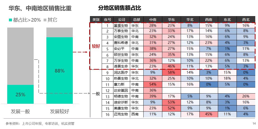 研究还发现88%的较好企业,有能力同时布局两个地区——他们在中南和华东地区的售额占比均大于20%,相对均衡。例如基蛋——28%在中南,23%在华东;万泰——23%在中南,33%在华东;安图——32%在中南,24%在华东。