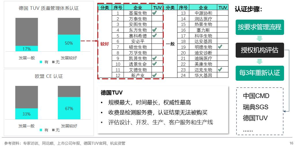 企业可以自愿选择授权机构来获取国际ISO认证,然而不同国家不同机构的审核难度有所差异。国内的北京国械华光(CMD)、瑞典的SGS、德国的TUV都是有代表性的认证机构。其中,德国TUV规模最大、成立时间最长、权威性最高、审核难度最大。因此,具备德国TUV认证的IVD企业,具有更可靠的质量管理体系。