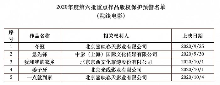36氪获悉,据国家版权局官方微信公众号消息,按照国家版权局《关于进一步加强互联网 传播作品版权监管工作的意见》及版权重点监管工作计划,根据相关权利人上报的作品授权情况,现公布2020年度第六批重点作品版权保护预警名单。《夺冠》等5部电影入选重点作品版权保护预警名单。