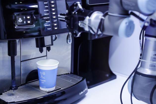 大白的“双臂”也标志着它采用了“机械臂技术”,一杯咖啡的冲泡,从用户点单,他就开始识别和选择各种原料,然后磨咖啡豆、冲泡,倒入杯中、拉花等动作……这一系列的工序,复刻了人类咖啡师的工作。