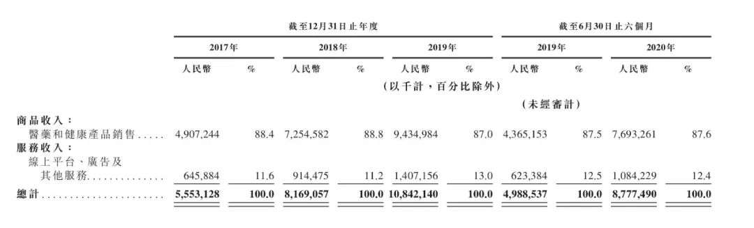 从收入构成来看,来自医药和健康产品自营销售的商品收入为主要收入来源,在2017年至2019年,以及2020年上半年的收入占比分别为88.4%、88.8%、87.0%和87.6%。京东健康预计,随着用户数的不断增加,商品收入仍将是收入的重要增长点。