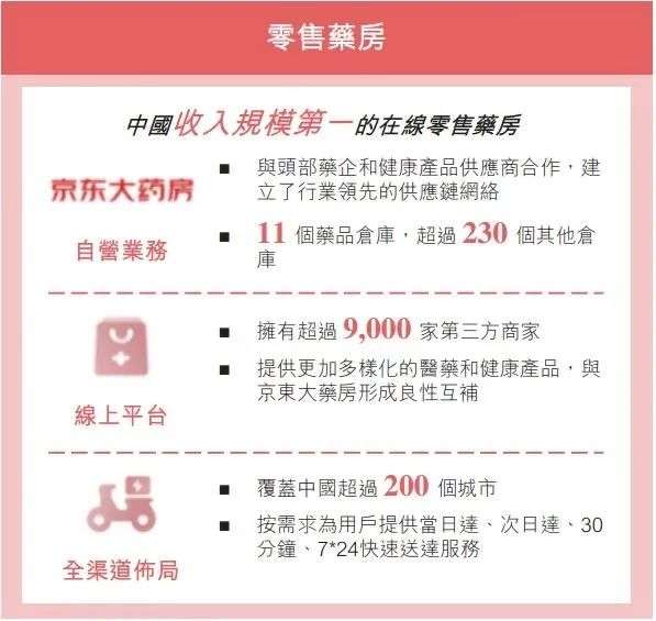此外,京东健康的全渠道布局则指按需求为用户提供当日达、次日达、30分钟、7*24快速送达服务,现已覆盖超过200个城市。