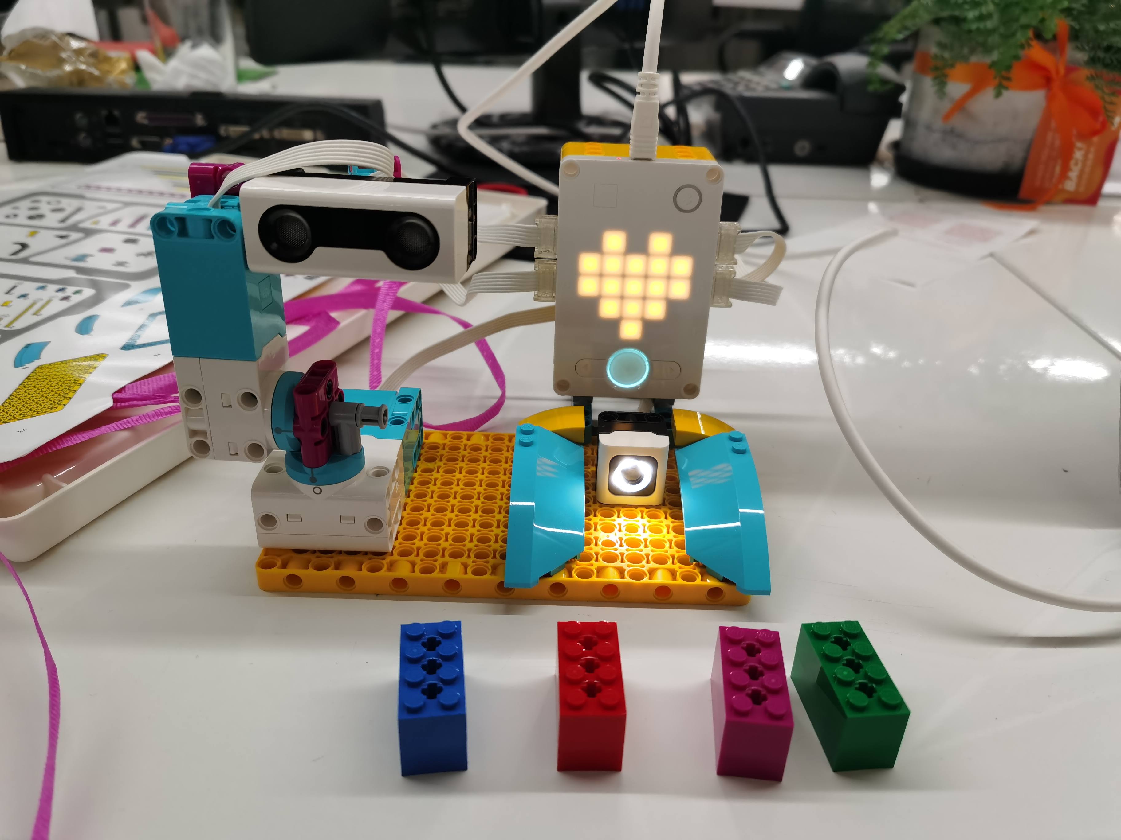 首先我们需要设计和搭建一个工厂机器人,并对其进行编程,使其能够根据颜色识别和装运包裹。于是,笔者使用不同颜色的乐高积木代表不同类型的包裹。